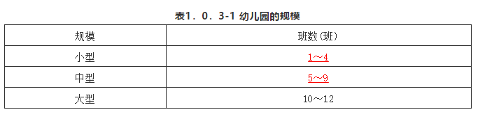 第 1.0.3 条 托儿所、幼儿园是对幼儿进行保育和教育的机构。接纳三周岁以下幼儿的为托儿所,接纳三至六周岁幼儿的为幼儿园。一、幼儿园的规模(包括托、幼合建的)分为:大型:10 个班至 12 个班。中型:6 个班至 9 个班。小型:5 个班以下。