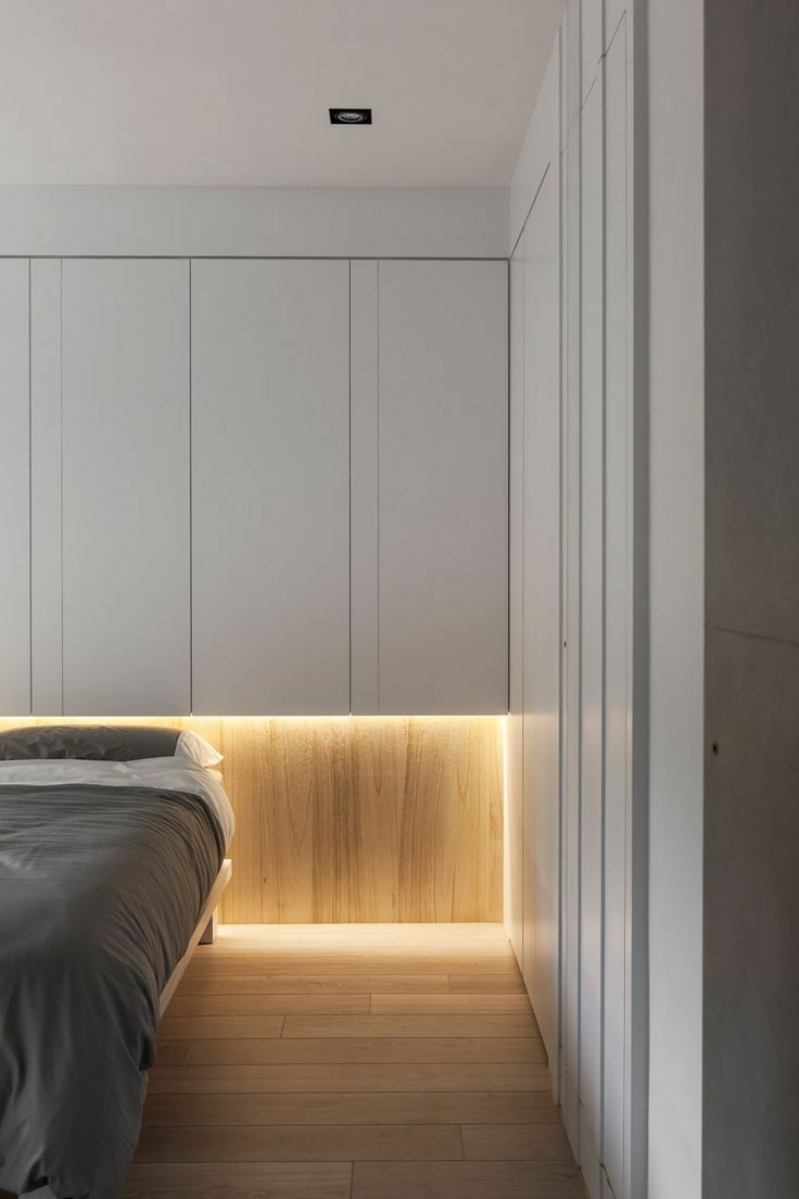 另外,在门板上抠出门把手的造型,将门板下沿做成倒角等,既能弱化把手存在感,又能方便打开柜门的设计方式,也可以非常适合极简主义者使用。
