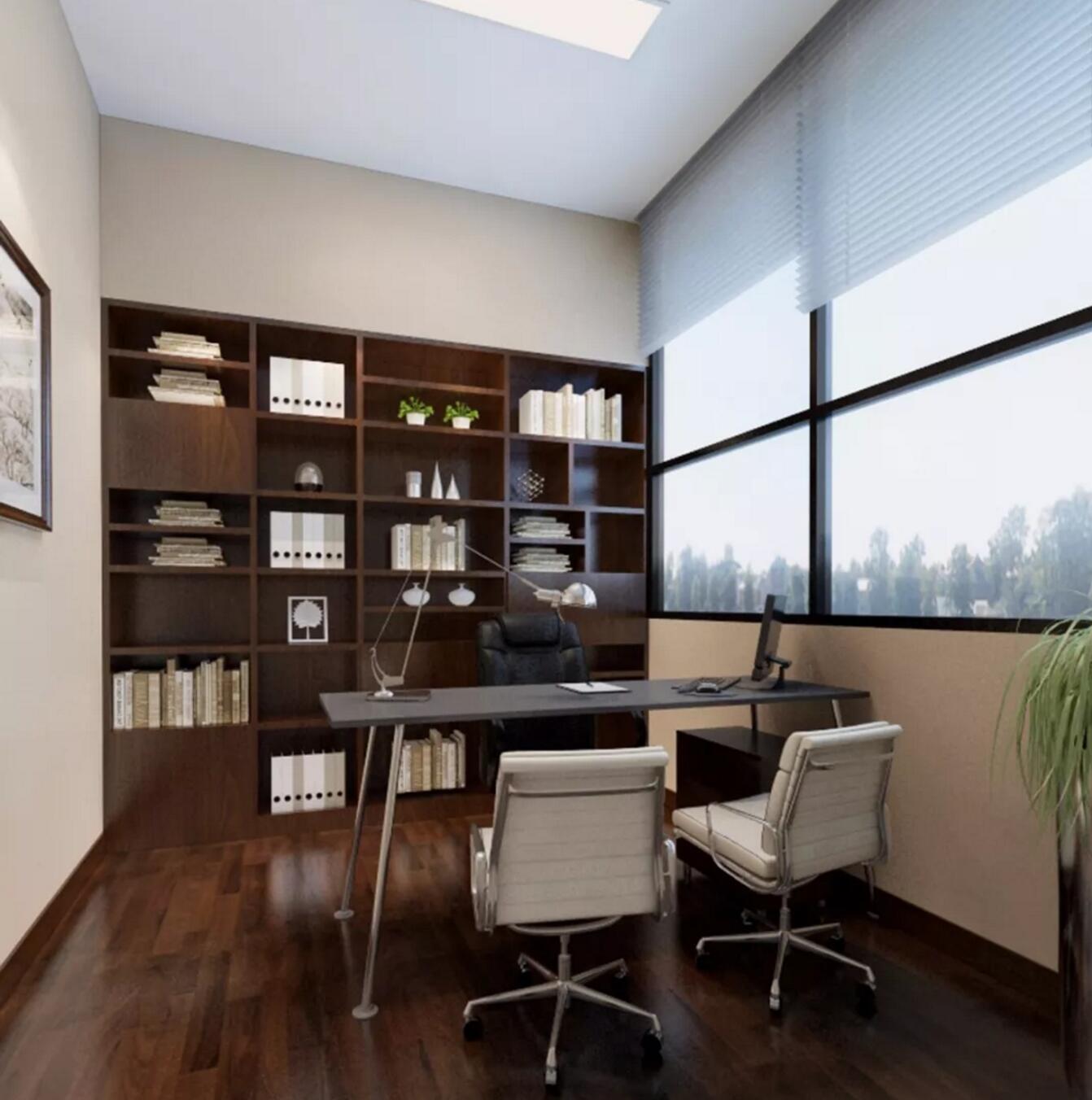 如果办公室的空间不够宽敞,可以巧妙地使用大面积的玻璃式落地窗,不仅带来充足的光线,还能够有效的拉伸视觉,增加空间的范围感。