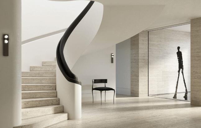洁白的楼梯扶手在阳光的辉映下显得空灵纯净,亮眼的艺术画作又将原本寂静的氛围点燃。楼梯右侧摆放了单只黑色脚部的写实雕塑,在大面积白色背景映衬下,进一步加大本案的艺术气息。