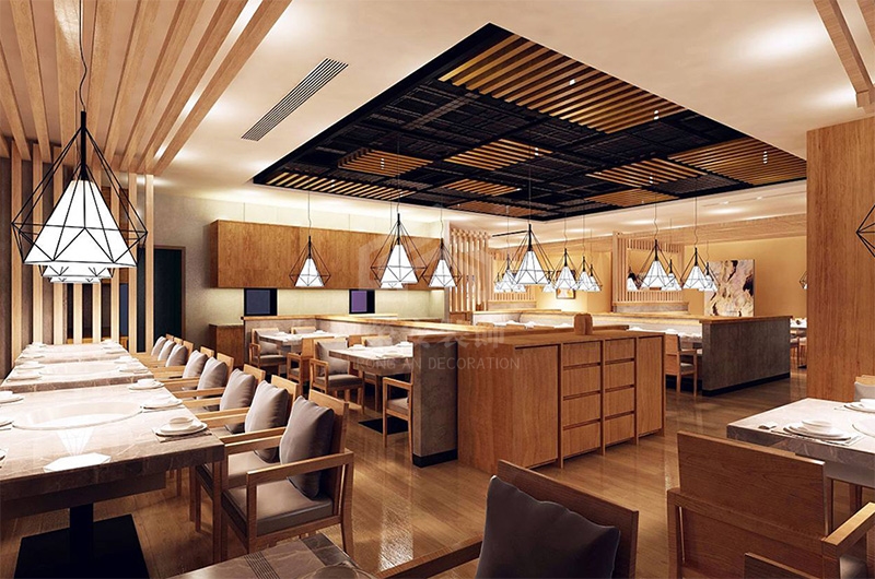 尽量不用使用单一的顶灯,尤其是避免使用吊灯光源,采用导轨射灯,或者配合台灯,落地灯等光源营造多层次,具有变化的环境。王猪排韩式料理店总面积约为300平, 韩式餐厅设计装修设计中使用的材质以银色不锈钢和原木色木作为主要材料,黄+灰,韩式餐厅设计装修恰到好处的优雅与安宁,暖黄色来调和再利用灰色进行平衡,韩式餐厅设计装修既柔和舒缓,营造出平衡的美感使客人宾至如归.韩式餐厅设计装修搭配小青砖和落地窗,家具选用通透感强和矮一点的沙发。避免高倍的沙发和椅子,这样可以增加空间的整体层次感。第四,如果选用壁纸,尽量不要选择大花花纹,天花则淡化处理,用黑色亚克力和木格栅拼接,做出几何的造型突出韩式餐厅设计装修简约现代的设计理念.