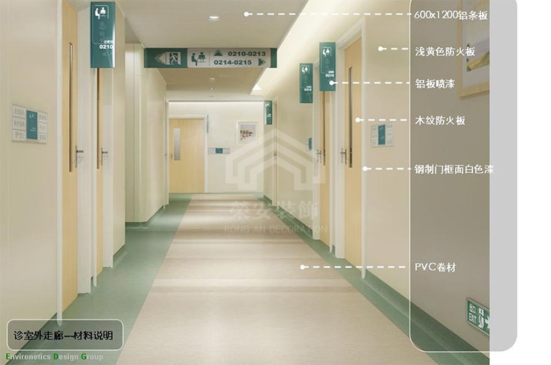 北大业内医院的室内设计以米白、绿色为主色调,社区医院装饰装修体现医院挽救生命的神圣使命与充满温暖关怀的场所氛围。